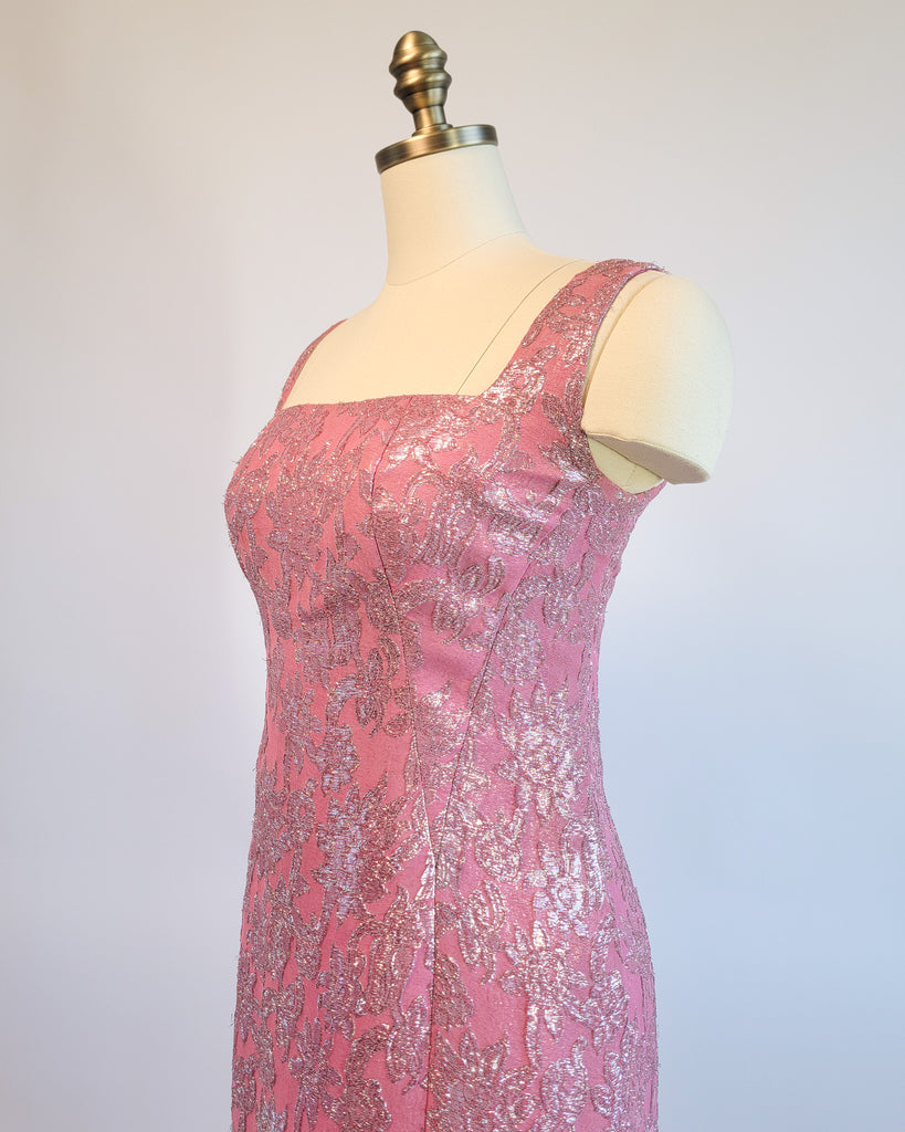 Get ready to party like it's the 60s in this bubblegum pink and silver lamé mini dress. The unique brocade fabric adds extra flair to your look. Just add your favorite music and you're set!